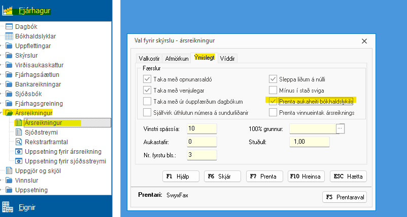 Þegar tekinn er út ársreikningur er farið í flipann "Ýmislegt" og haka við "Prenta aukaheiti bókhaldslykils".