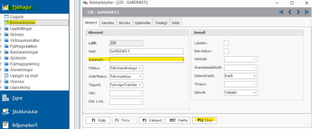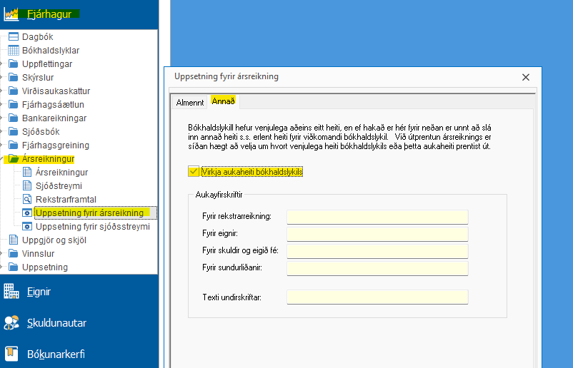Byrja á því að fara í Fjárhagur > Ársreikningur > Uppsetning fyrir ársreikning > velja flipann "Annað" og haka við "Virkja aukaheiti bókhaldslykils".