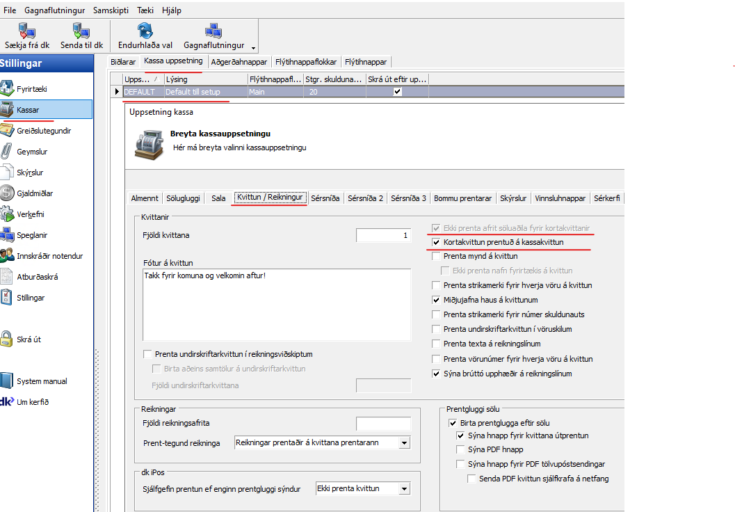 Stillingar - Kassar - Kassa uppsetning - smella á viðeigandi kassa uppsetningu (DEFAULT) - Fara í flipann Kvittun / Reikningur