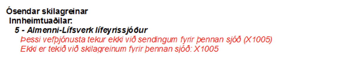 Ef það virkar enn ekki að senda skilagreinina þá skal athuga hvort númer lífeyrissjóðsins sé rétt. Það skal vera 5 og séreign Almenna-Lífsverk er númer 4. Engin formerki mega að vera á undan.