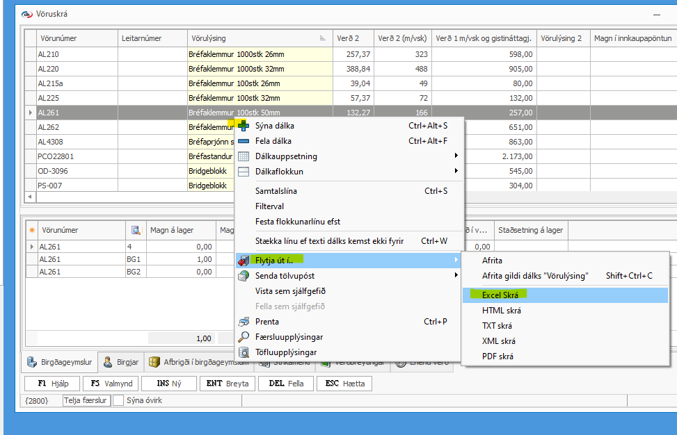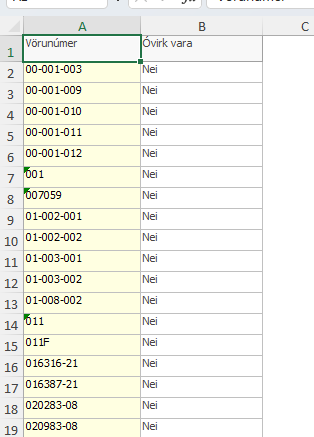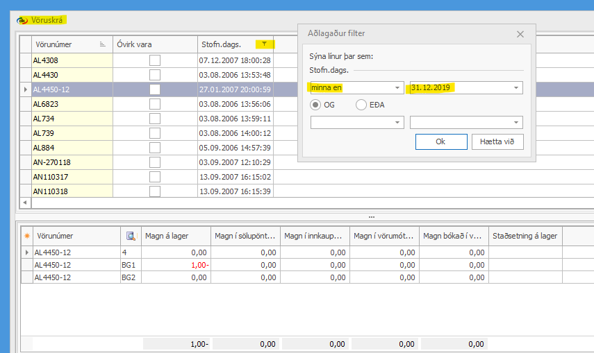 Gott er að sía út vörunúmer sem stofnuð voru frá 2018 - 2019 og taka svo listann út.