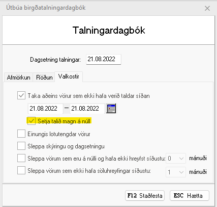 Ný dagbók er stofnuð, farið er yfir afmörkun og í valkostum er sett inn sama dagsetning og var í síðustu talningu. Hægt er að sleppa vörum sem eru á núlli og hafa ekki hreyfingu innan ákveðins tímabils.