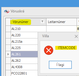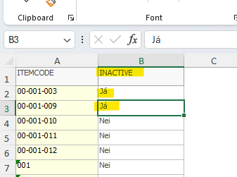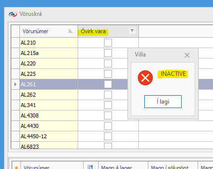 Passa að vera með dálkinn vörunúmer (itemcode) og dálkinn óvirk vara (inactive) væri þá heitið efst á þeim dálk.