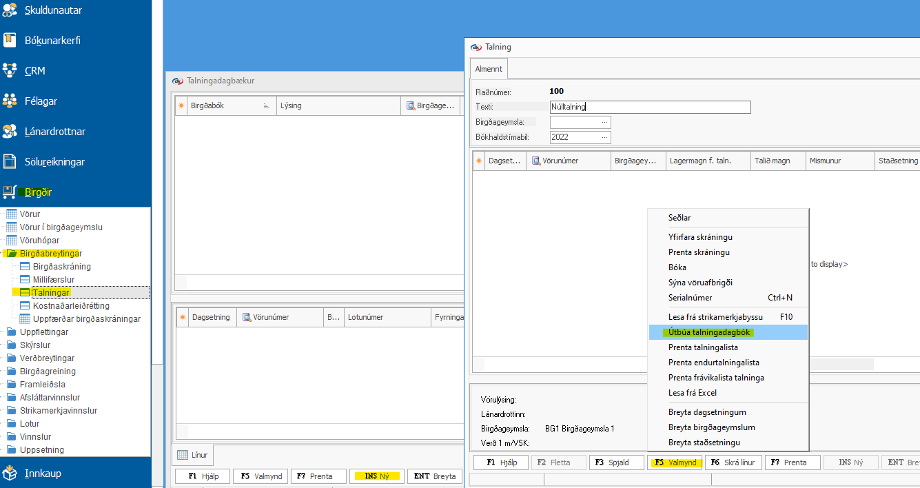 Birgðir > Birgðabreytingar > Talningar > INS Ný > F5 Valmynd > Útbúa talningardagbók
