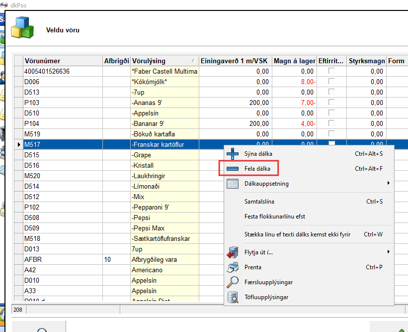 Þá þarf viðkomandi að skrá sig inn sem verslunarstjóri eða admin, ýta á vörur / skuldunauta, hægri smella og velja fela dálka: