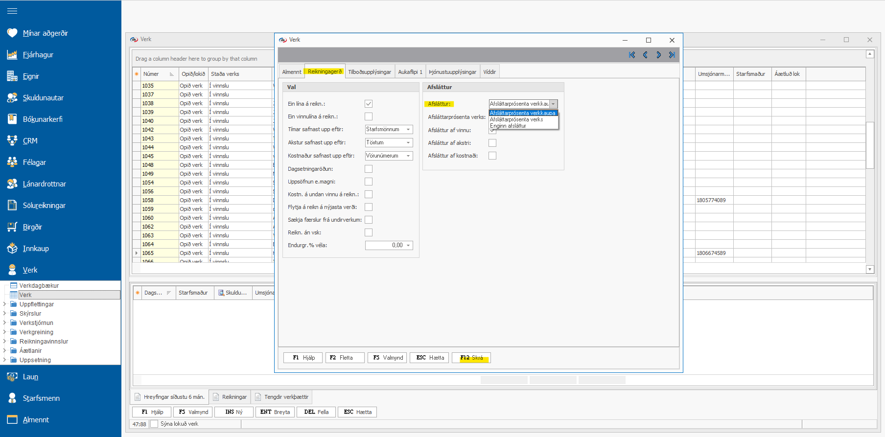 Verk - endurreikna hreyfingar Ef búið er að setja hreyfingar á verk og vörunúmer síðan uppfært þá er hægt að endurreikna hreyfingar á verki með því að fara undir Verk > Uppflettingar > Verk > * fyrir öll verk eða einstaka verk > CTRL+A fyrir allar ...