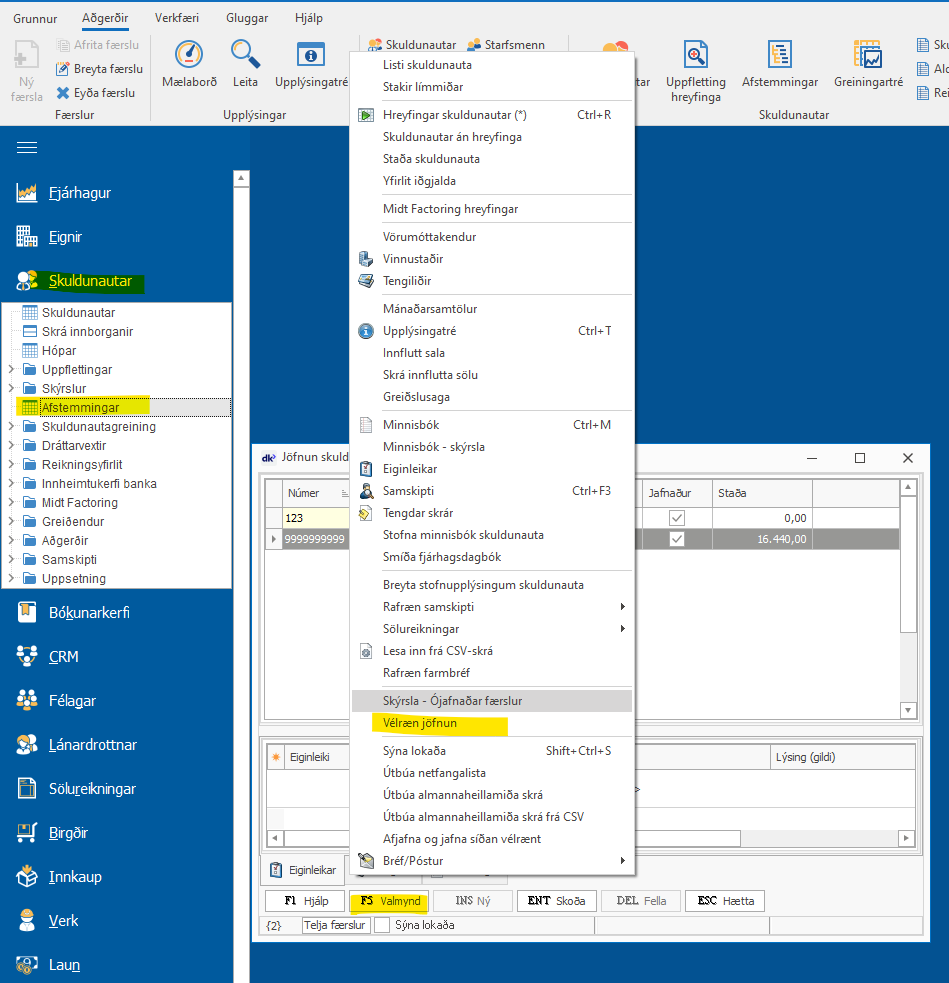 Skuldunautar eru jafnaðir undir Skuldunautar > Afstemmingar. Þar er hægt að opna hvern og einn skuldunaut og jafna handvirkt eða vélrænt jafna. Einnig er hægt að vélrænt jafna alla skuldunauta í einu með því að smella á F5 Valmynd > Vélræn jöfnun.