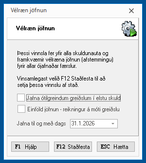 Við það opnast þessi gluggi þar sem hægt er að velja að "jafna ótilgreindum greiðslum í elstu skuld" eða "einfalda jöfnun - reikningur á móti greiðslu". Að lokum er valin dagsetning jöfnunar og smellt er á F12 Staðfesta.