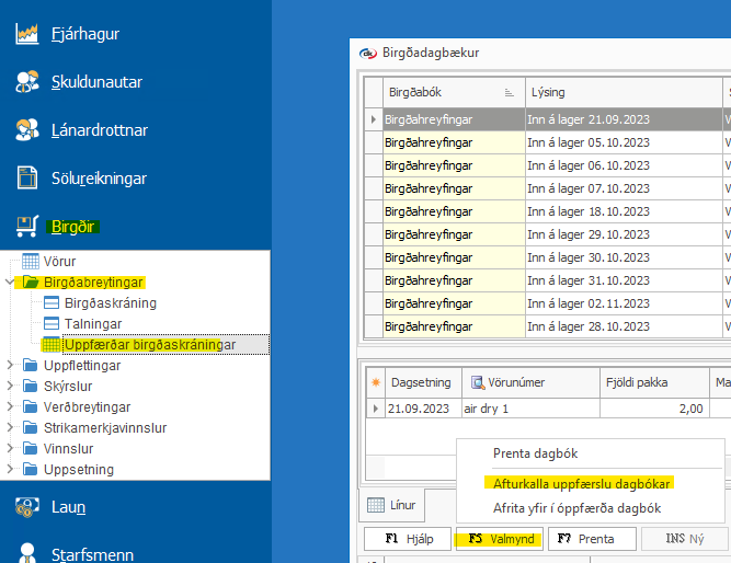 Að afturkalla uppfærða birgðadagbók er gert undir Birgðir > Birgðabreytingar > Uppfærðar birgðaskráningar > Hefur birgðadagbókina valna sem á að afturkalla > F5 Valmynd > Afturkalla uppfærslu dagbókar