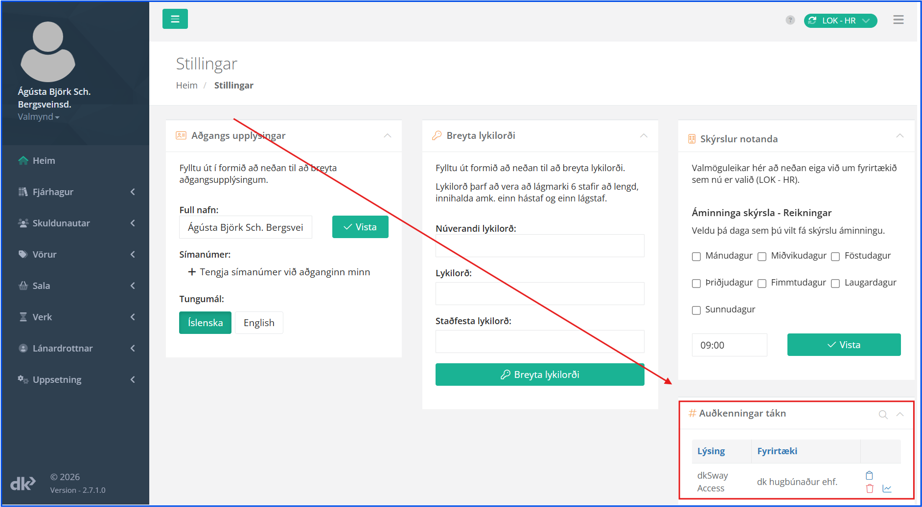 Auðkenningartákn (token) er eins konar stafrænn lykill sem er notaður til að tengja aðra þjónustu við gögn fyrirtækisins í dk.