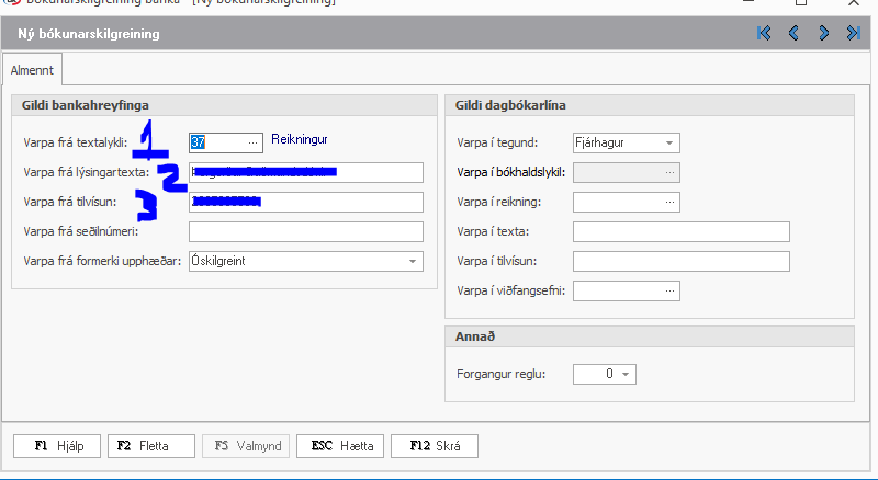 Fjárhagur > Bankareikningar > Uppsetning > Bókunarskilgreining banka