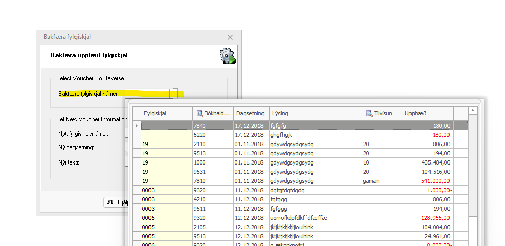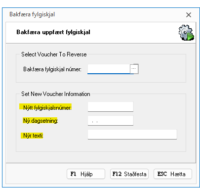 Þá þarf að velja hvaða fyigiskjal á að bakfæra. Fylgiskjalið er valið með því smella á punktana þrjá í reitnum Bakfæra fylgiskjal númer, þar sem fylgiskjalsnúmerið valið með því að tvísmella á rétt fylgiskjal eða hafa línuna valda og smella á enter. Þegar það er búið eru settar inn upplýsingar um dagsetningu og fylgiskjalsnúmer og texta ef óskað er. Að lokum er staðfest með F12 Staðfesta og þá birtist færslan með öfugum formerkjum. Gott er að ganga úr skugga um að tegundarmerking fyrir skuldunauta og lánardrottna sé til staðar ef við á.