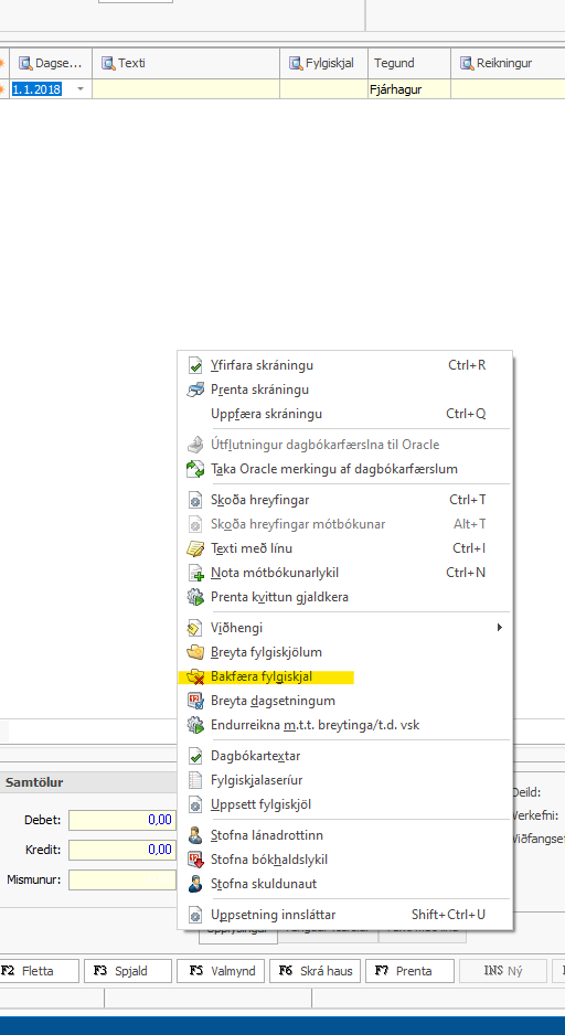 Hægt er að bakfæra stakt fylgiskjal í fjárhag. Byrjað er á að stofna fjárhagsdagbók og fylla út helstu upplýsingar eins og lýsingu og bókunarár. Síðan er smellt í skráningarsvæðið og þar á F5 Valmynd > Bakfæra fylgiskjal.