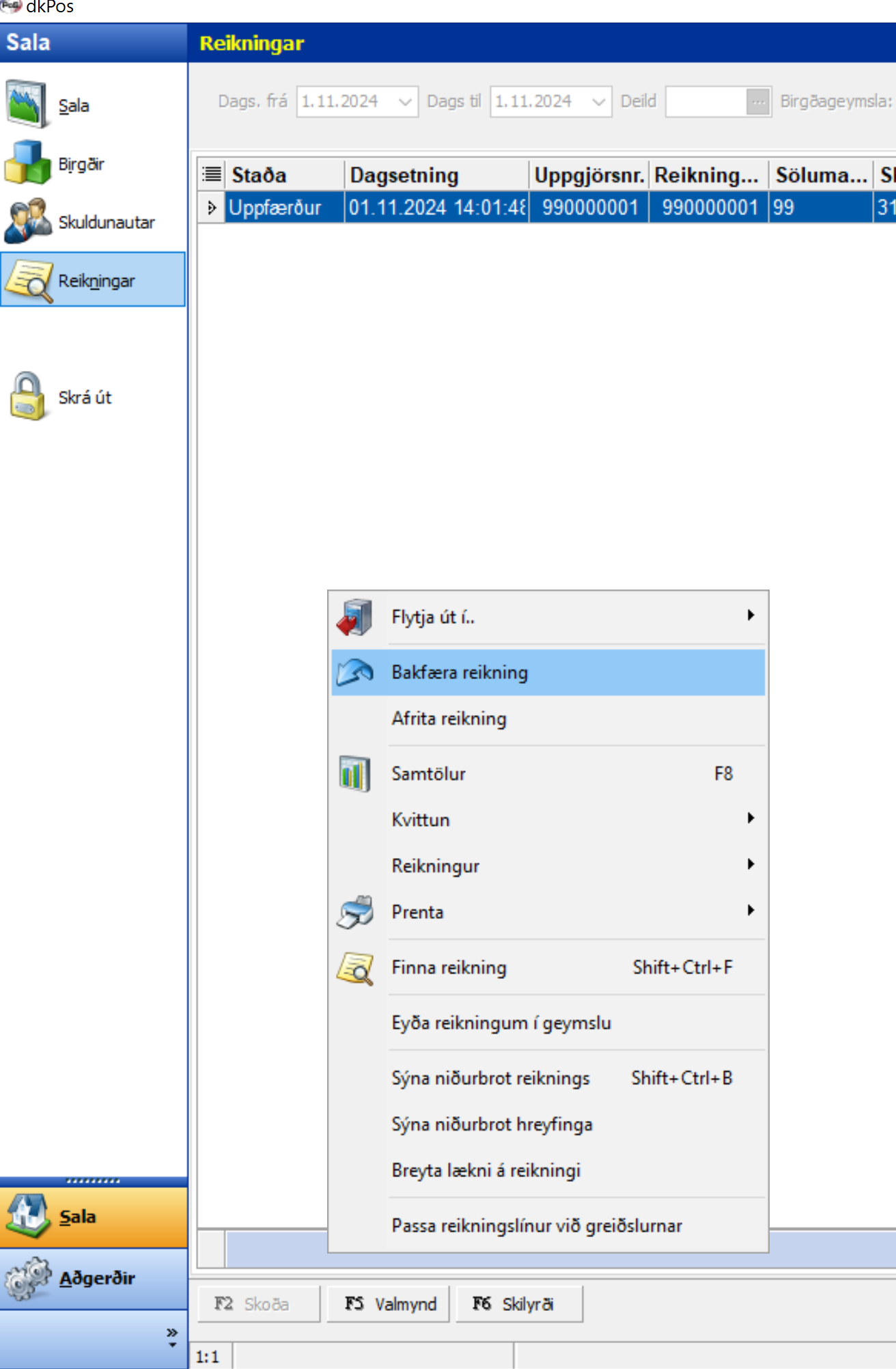 Að bakfæra sölu í dkPOS er gert svona: Fara í sala - reikningar - finna reikninginn með því að fletta upp dagsetningunni eða skoða í listanum. Vera með reikninginn valinn (línuna bláa) F5 valmynd - Bakfæra reikning. Velja síðan Borga og velja SAMA ...