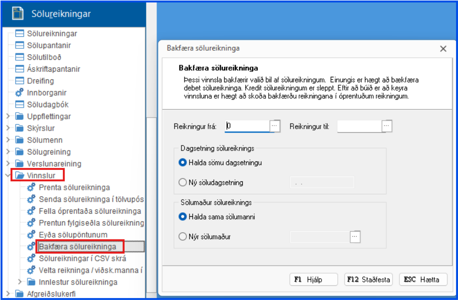 Fara í: Sölureikningar > Vinnslur > Bakfæra sölureikninga
