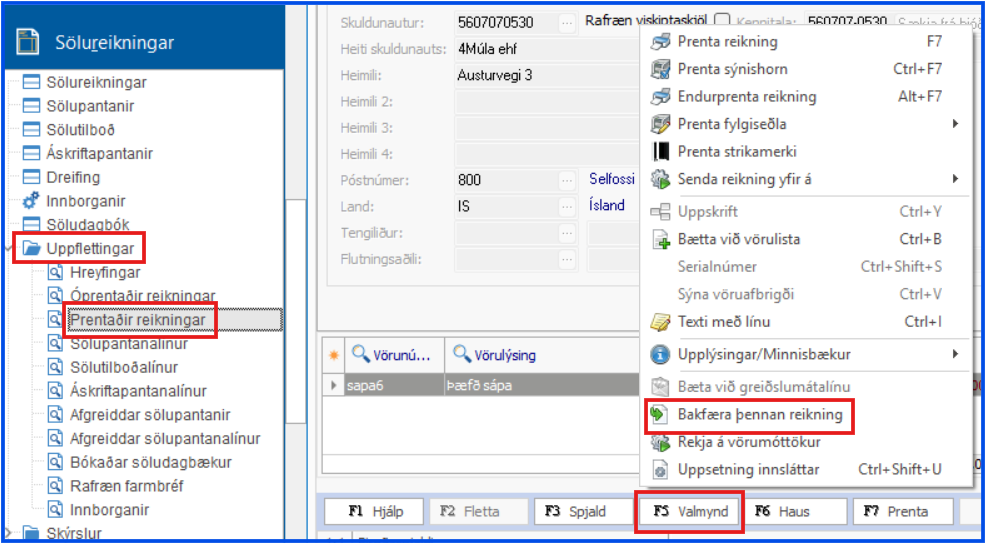 Fara í: Sölureikningar > Sölureikningar > F5 Valmynd > Bakfæra prentaðan reikning