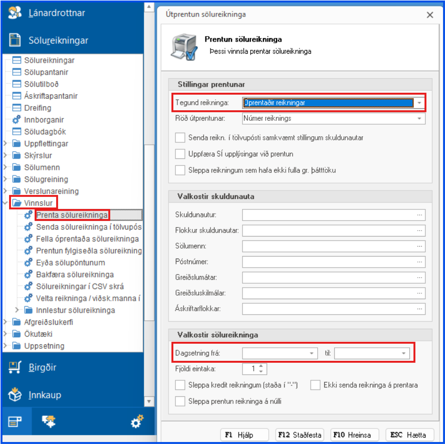 Sölureikningar > Vinnslur > Prenta sölureikninga
