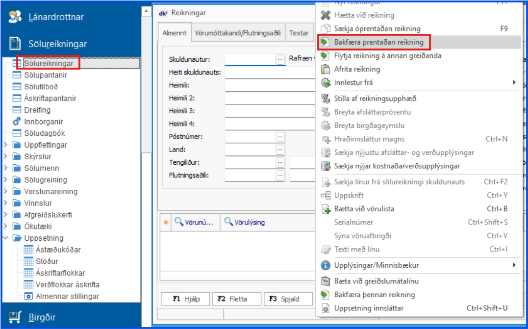 Úr nýjum (tómum) sölureikningi: Bakfæra prentaðan reikning