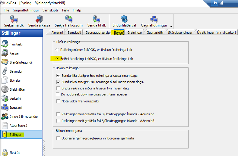 Stillingar → Stillingar → Bókun (flipi 3) → Haka í ,,Beiðni á reikningi í dkPos, er tilvísun í