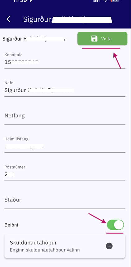 Í dkPos appinu er hægt að tengja við strikamerkjaskanna með bluetooth. Þá er valið hér innsláttur í appinu sjálfu til að skanna inn strikamerkin. Undir stillingar og tegund strikamerkjalesara í appi. Til að athuga hvort að skanninn sé stilltur rétt ...
