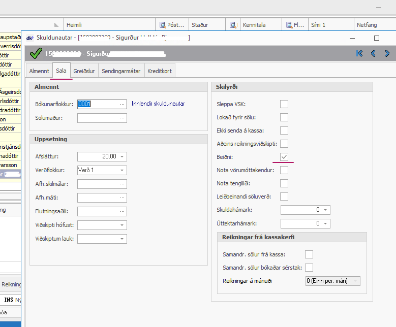 Ef að beiðnir/tilvísanir á reikningi í dkPos eiga að skila sér inn sem tilvísun á reikninga í dk. Þá er það stillt í bakvinnslunni undir: Stillingar → Stillingar → Bókun (flipi 3) → Haka í ,,Beiðni á reikningi í dkPos, er tilvísun í reikninga í dk." ...
