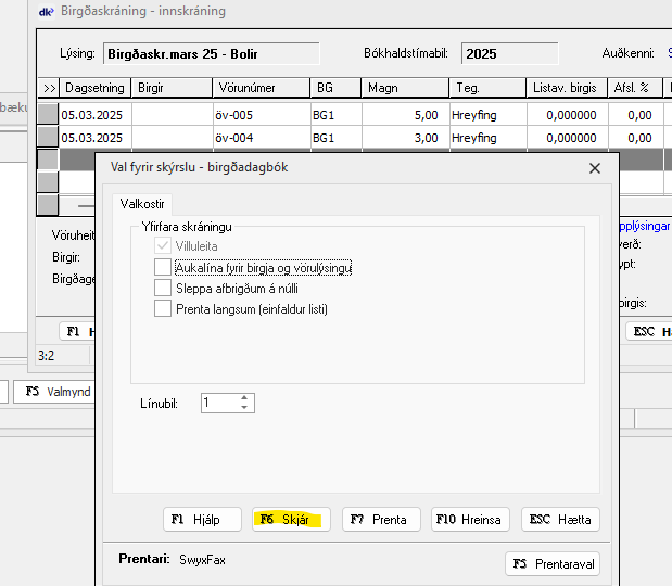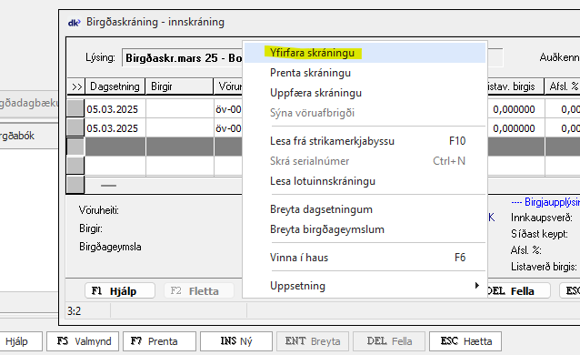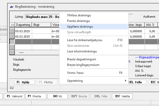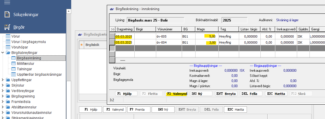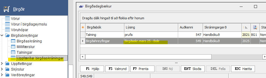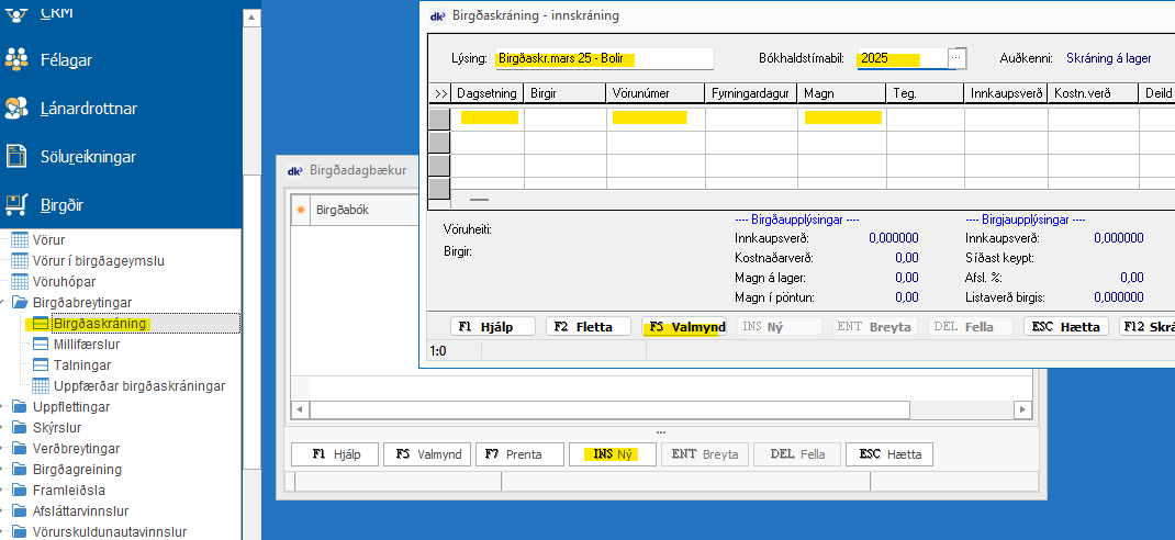 Birgðabókinni er gefið nafn í lýsingu og síðan eru skráðar inn línur í bókina. Lesa má inn færslur vélrænt með [F5 Valmynd] – Lesa frá strikamerkjabyssu.