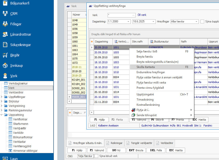 Verk - breyta uppfærðum hreyfingum Eftir að búið er að uppf´ra verkdagbækur læsast hreyfingar í verki. Ef það þarf að gera breytingar á hreyfingunni þá er það gert með því að finna verkið > F5 Valmynd > Hreyfingar eða nota flýtileiðina CTRL+R Undir ...