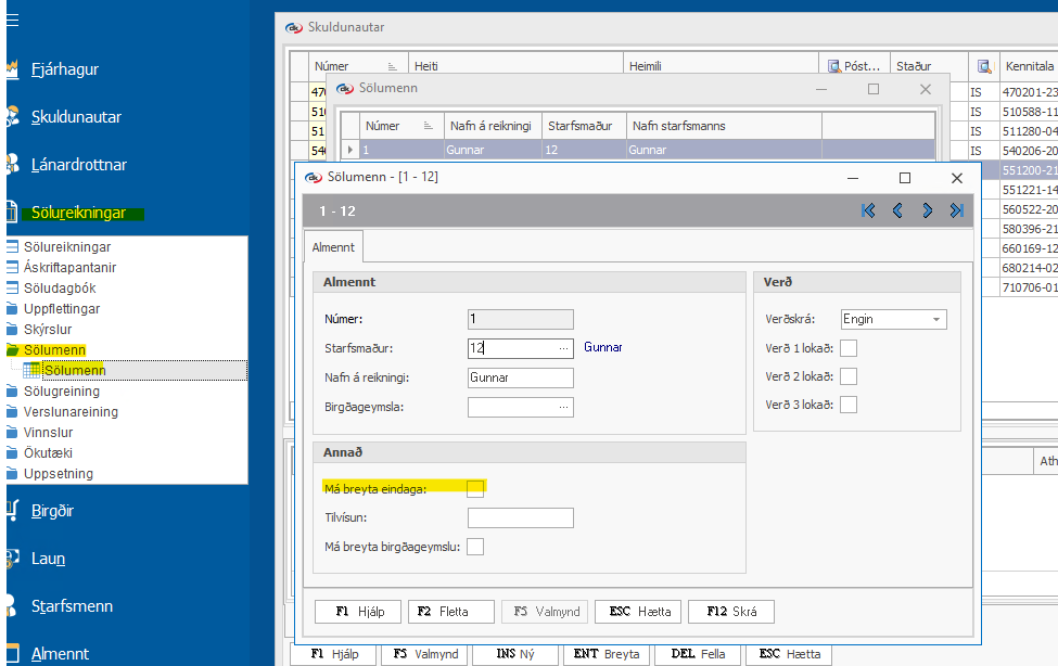 Góðan daginn Til að hægt sé að breyta eindaga á sölureikningi þarf sölumaðurinn sem stofnar reikninginn að hafa heimild til þess. Svona virkjarðu heimildina: Farið í Sölureikningar > Sölumenn > Sölumenn. Finnið viðkomandi sölumann og opnið spjaldið ...
