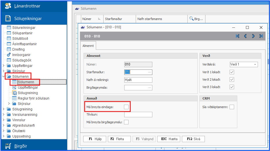 Breyting á eindaga Farið er undir Sölureikningar > Sölumenn > Sölumenn, tvísmellt á sölumanninn sem er skráður á reikninginn, hakar við "Má breyta eindaga".