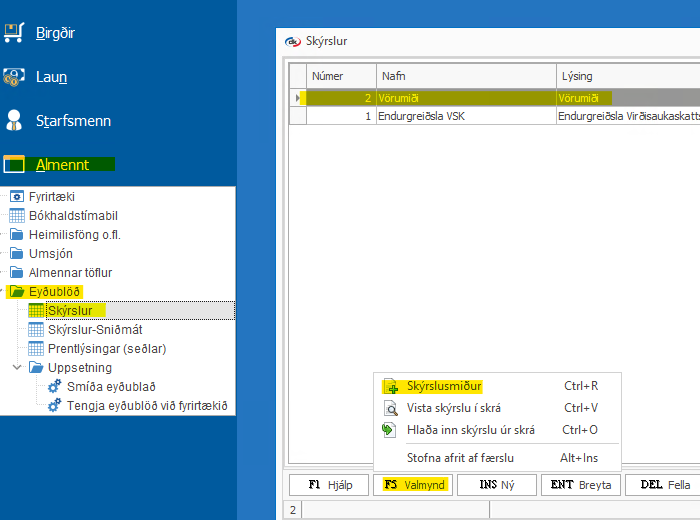 Almennt > Eyðublöð > Skýrslur > Velur skýrsluna sem á að breyta > F5 Valmynd > Skýrslusmiður