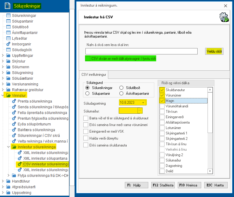 Sölureikningar > Vinnslur > Innlestur sölureikninga > CSV innlestur sölureikninga.