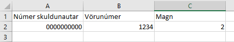 1. Byrja þarf á því að búa til excel skrá með upplýsingum um númer skuldunautar, vörunúmerum, magni o.fl.