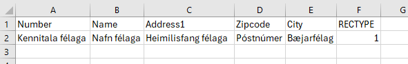 Hér er dæmi um það hvernig skjalið gæti verið sett upp. Dálkur F er hér umræddur RECTYPE dálkur.