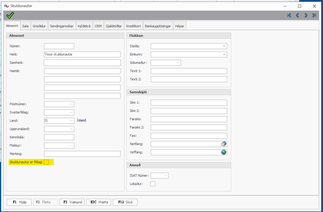 Félagaskráin og skuldunautaskráin er sú sama, það þarf því að tilgreina við innlesturinn að stofna eigi félagann einnig í félagaskránni. RECTYPE dálkurinn bætir því við haki í dálkinn "Skuldunautur er félagi".