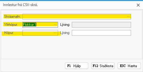 Skráin er lesin undir: Birgðir > Vöruhópar > F5 Valmynd > Lesa inn vörur frá CSV-skrá