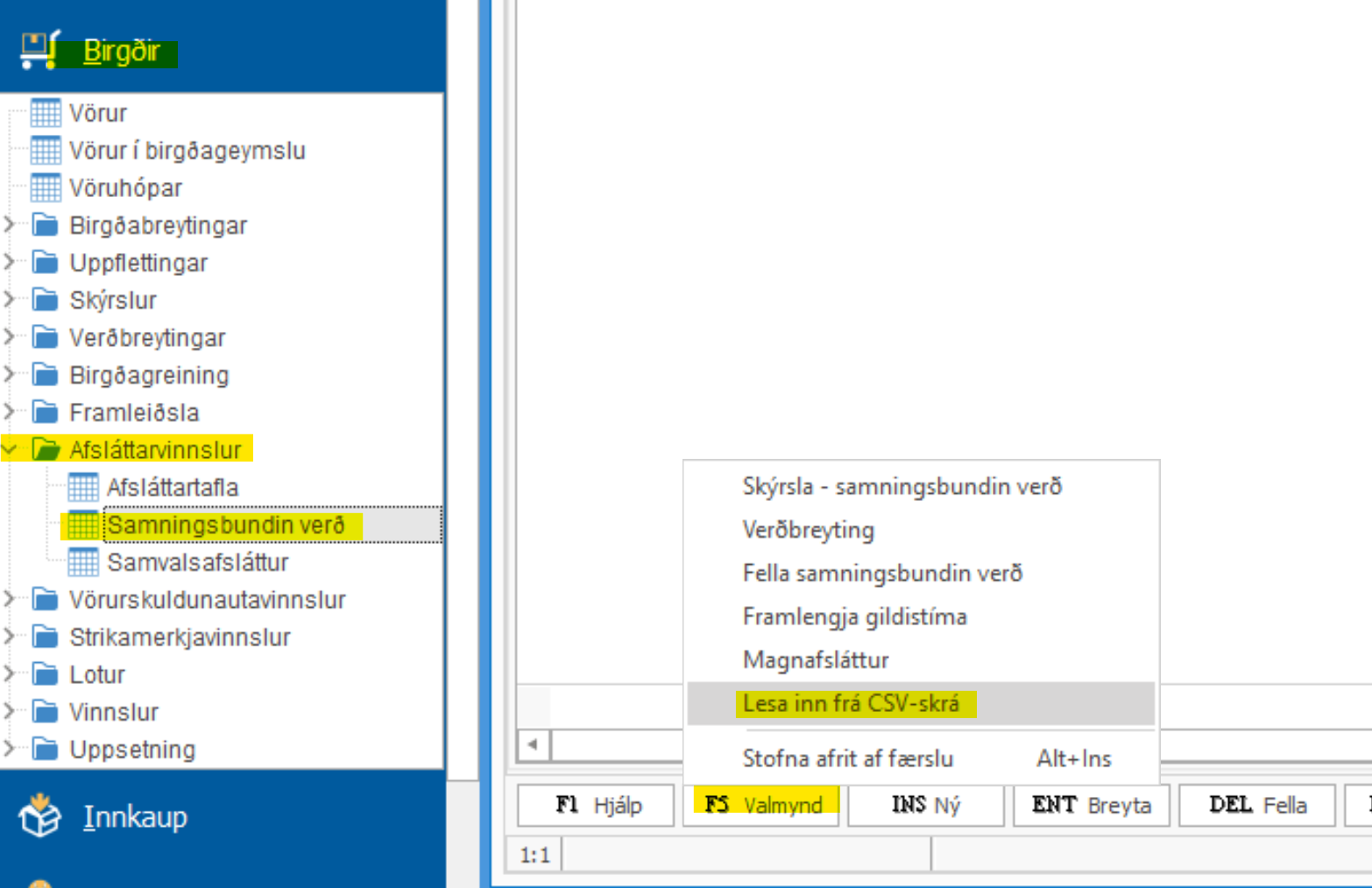 Skráin er lesin undir: Birgðir > Afsláttarvinnslur > Samningsbundin verð > F5 Valmynd > Lesa inn frá CSV-skrá