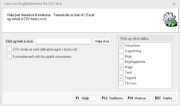 CSV innlestur birgðaskráning