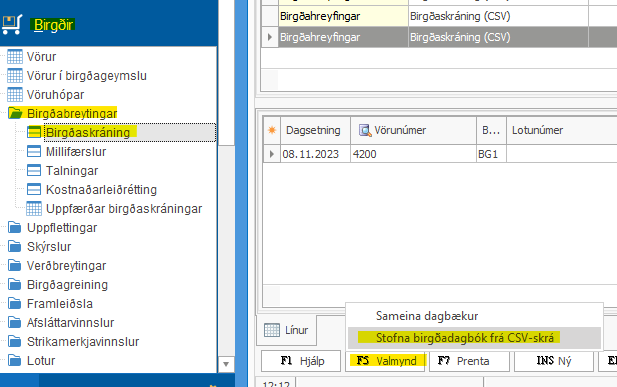 Skráin er lesin undir: Birgðir > Birgðabreytingar > Birgðaskráning > F5 Valmynd > Stofna birgðadagbók frá CSV-skrá