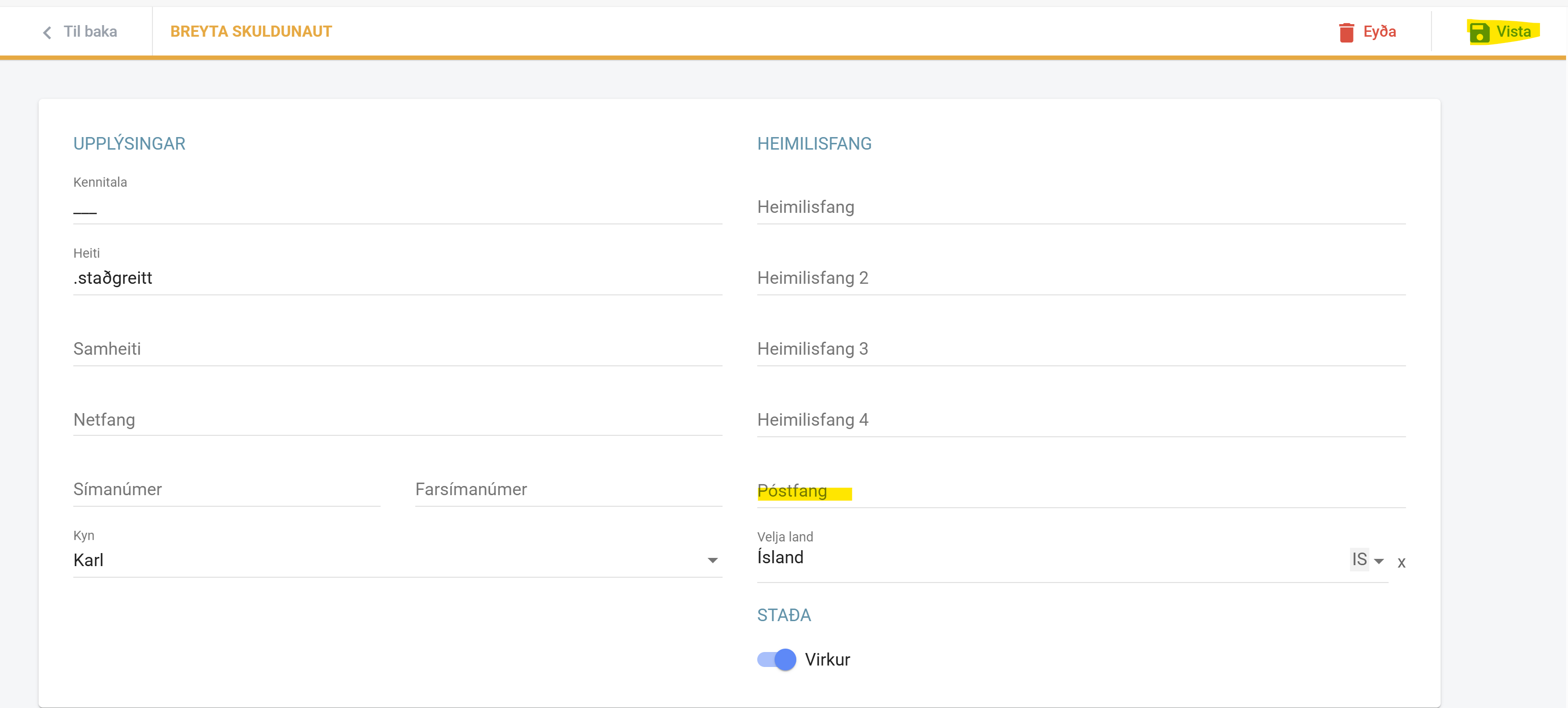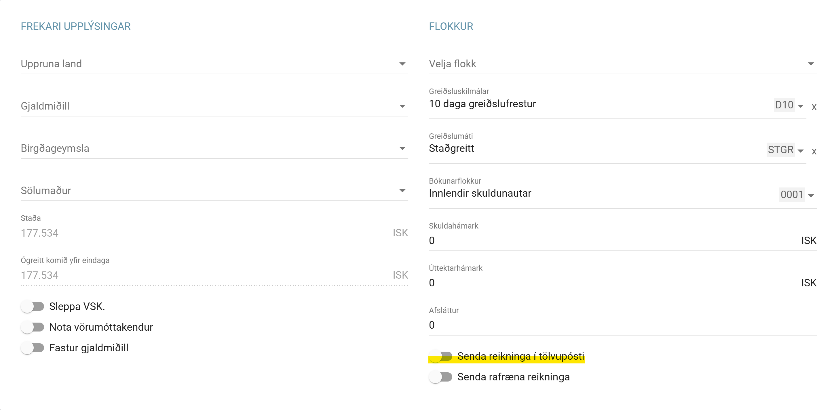 Það þarf því annað hvort að taka út hakið, eða skrá netfang á skuldunautaspjaldið.