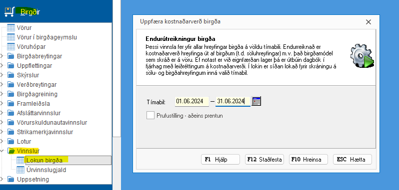 Þeir sem nota eignfærðan lager þurfa að uppfæra kostnaðrverð birgða. Það er gert undir Birgðir > Vinnslur > Lokun birgða. (Best að gera þetta mánuð fyrir mánuð miðað við eftir hvert vsk tímabíl)