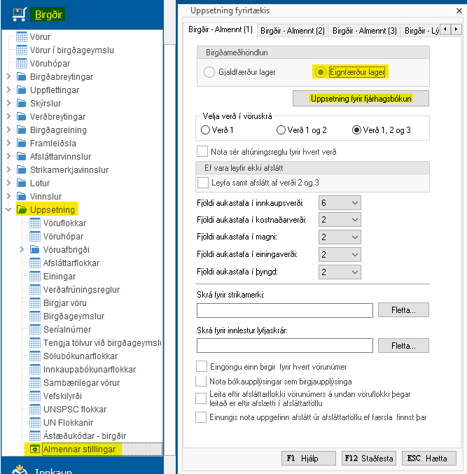 Sjálfgefin uppsetning á birgðakerfinu er að birgðir séu gjaldfærðar. Til að setja upp eignfærðan lager þarf að breyta uppsetningu í birgðum, breyta fjárhagslyklum, sölubókunarflokkum og innkaupabókunarflokkum.