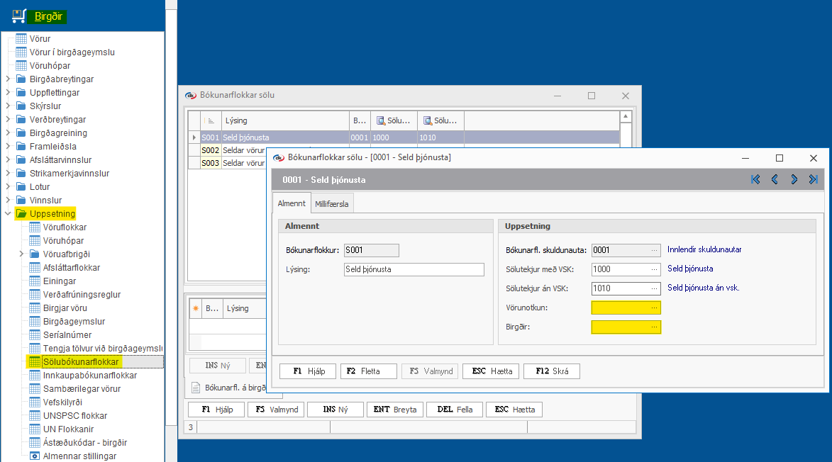 Velja þarf bókhaldslykil fyrir vörunotkun og birgðir á bókunarflokkum sölu undir Birgðir > Uppsetning > Sölubókunarflokkar.