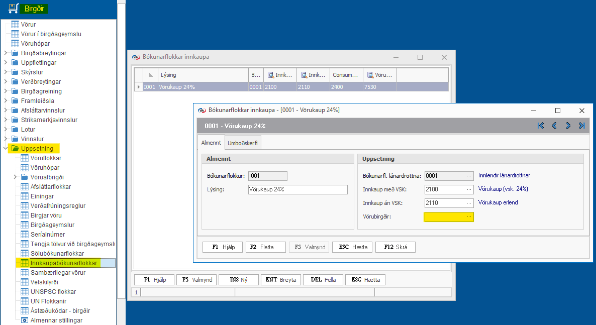 Velja þarf bókhaldslykil fyrir vörubirgðir á bókunarflokkum innkaupa undir Birgðir > Uppsetning > Innkaupabókunarflokkar.