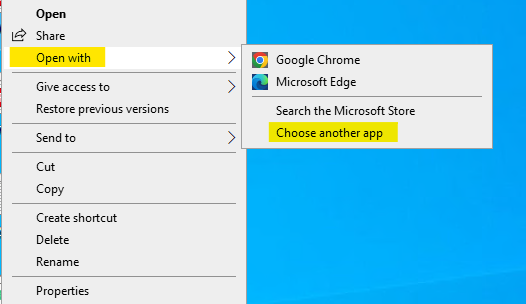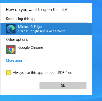 Þar er valið Microsoft edge og hakað í Always use this app to open .PDF files