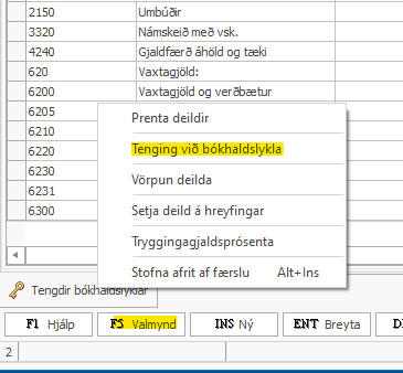 Lausn: Almennt > Víddir > Deildir > Hafa deildina valda svo línan er grá > F5 Valmynd > Tenging við bókhaldslykla.