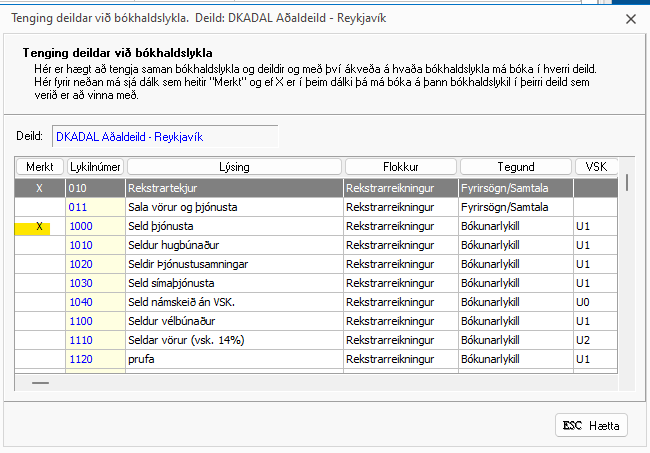 Setja hak í bókhaldslyklana sem má bóka á í viðkomandi deild með því að smella á Space Bar og svo hætta. Eftir það er hægt að bóka á deildina.