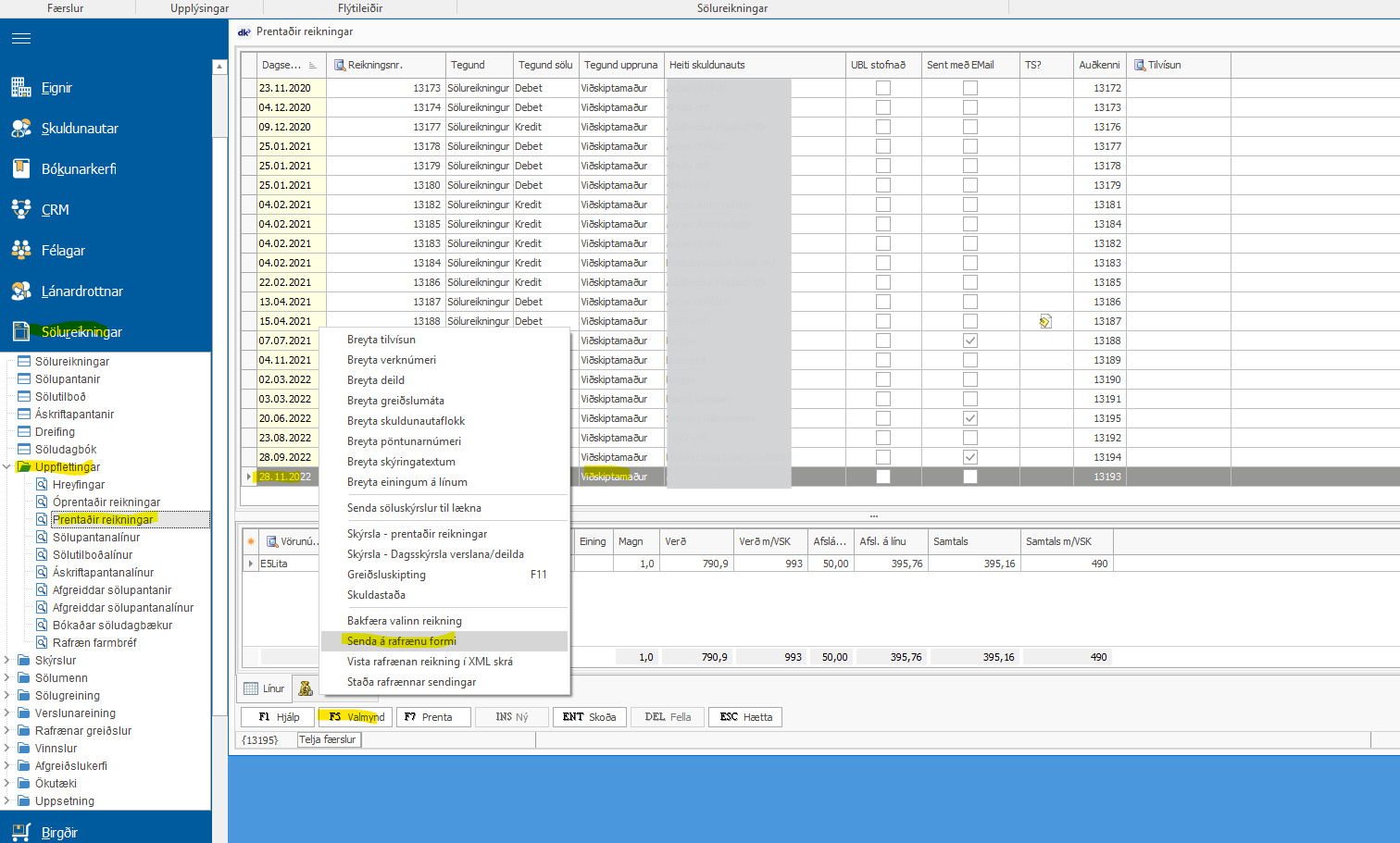 Reikningur er valinn (ekki opnaður), Smellt er á F5 valmynd, og valið að "Senda á rafrænu formi".
