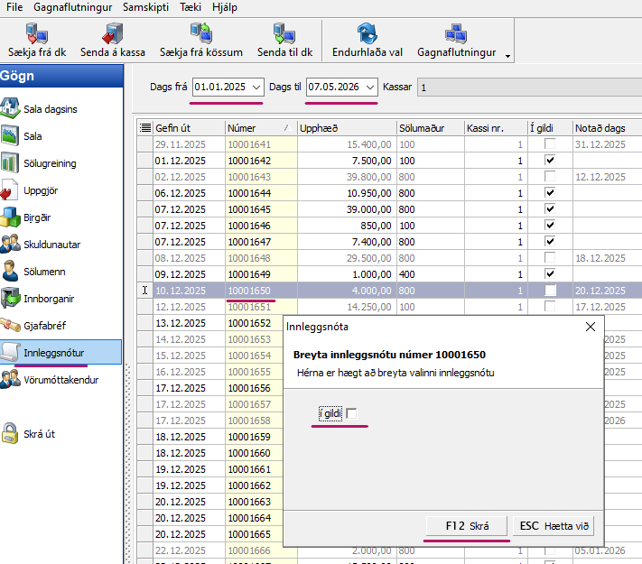 Fara í gögn - Innleggsnótur - velja viðeigandi dagsetningartímabil - tvísmella á innleggsnótuna sem á að virkja aftur eða óvirkja og ýta á í gildi - F12 skrá.