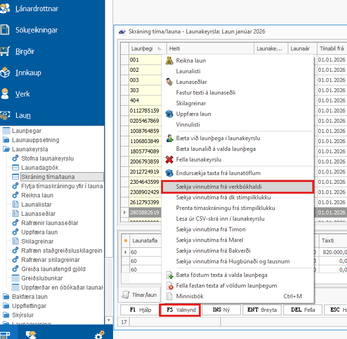 Ýtt er á F5 Valmynd og valið "Sækja vinnutíma frá verkbókhaldi"