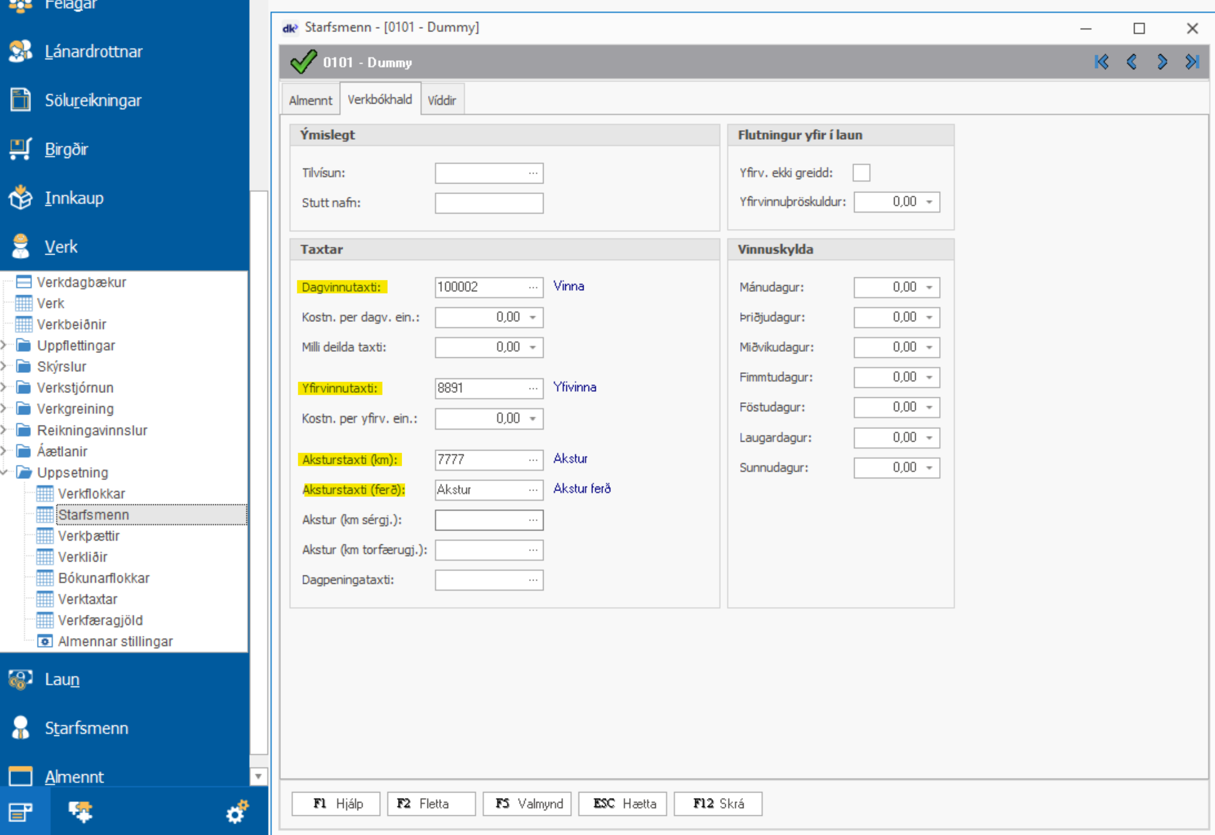Þarna er skilgreindur dagvinnutaxti starfsmanns við launalið 101 sem er dagvinna. Sama er svo gert fyrir alla taxta.
